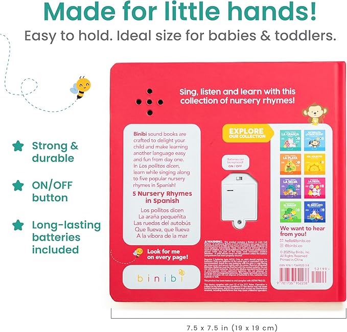 - ๐๐๐ฟ๐ฎ๐ฏ๐น๐ฒ & ๐ ๐ฎ๐ฑ๐ฒ ๐๐ผ๐ฟ ๐๐ถ๐๐๐น๐ฒ ๐๐ฎ๐ป๐ฑ๐. Binibi bilingual English-Spanish books for babies & toddlers 1-3 are durable and feature hard covers, thick pages and rounded corners - they are made for little hands and are easy to clean! All musical Spanish nursery rhyme books feature an on/off button for extended battery life, and easily replaceable batteries. 3 AG10 batteries in every book.