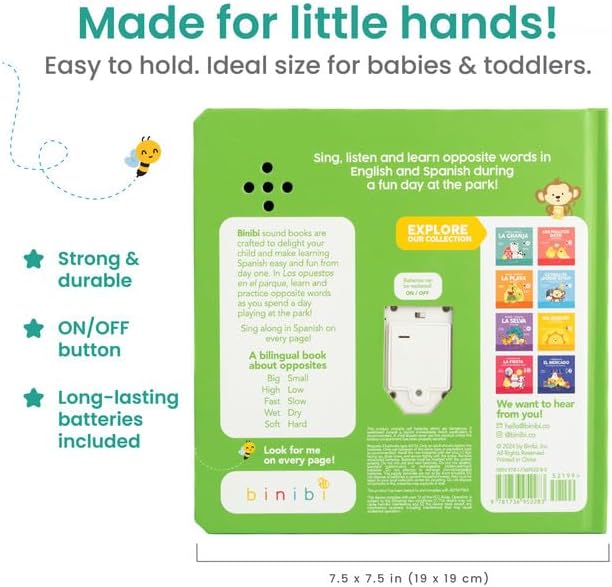 - 𝗕𝗶𝗹𝗶𝗻𝗴𝘂𝗮𝗹 𝗕𝗼𝗼𝗸 𝗔𝗯𝗼𝘂𝘁 𝗢𝗽𝗽𝗼𝘀𝗶𝘁𝗲𝘀 𝗙𝗲𝗮𝘁𝘂𝗿𝗶𝗻𝗴 𝗠𝘂𝘀𝗶𝗰 𝗶𝗻 𝗦𝗽𝗮𝗻𝗶𝘀𝗵 𝗼𝗻 𝗘𝘃𝗲𝗿𝘆 𝗣𝗮𝗴𝗲. This bilingual baby book is perfect for introducing babies and toddlers 1-3 to Spanish from the earliest age and for instilling a love for a second language. In this book, your child will learn ten opposite words in English and Spanish. Our spanish baby book features original songs and lyrics in English and Spanish so parents can follow along. All graphics and audio have been created exclusively for Binibi by Hispanic artists.