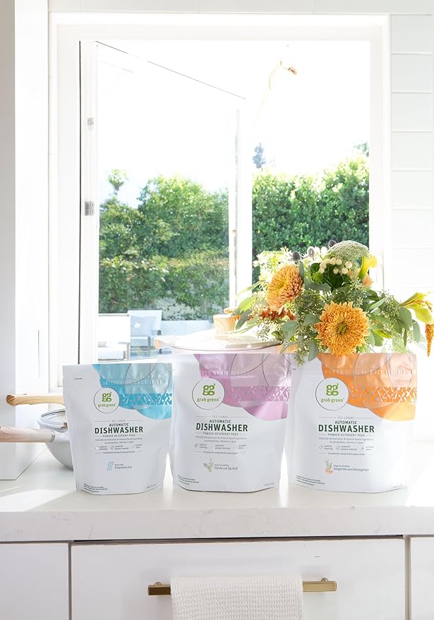 - Contains: 1- 60 Pod Bag of Grab Green Natural Tangerine with Lemongrass Automatic Dishwashing Detergent Pods. Our velcro closure bags are convenient and easy to use, no hassling with frustrating zip closures