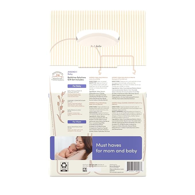 - Includes a 12 fl ounce bottle of Aveeno stress relief body wash for mom that combines natural colloidal oatmeal with scents of lavender, chamomile and ylang-ylang oils for a relaxing soap-free cleanse that is gentle enough to use on sensitive skin