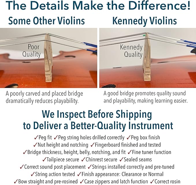 - [LIFETIME GUARANTEE] All of our Bunnel Pupil Violins are fully backed by a lifetime warranty and a 45-day money-back guarantee. Are you ready to try out your new Kennedy violin? We take our customer satisfaction seriously. Please reach out if you have ANY questions or concerns, we go to great lengths to make our customers happy!
