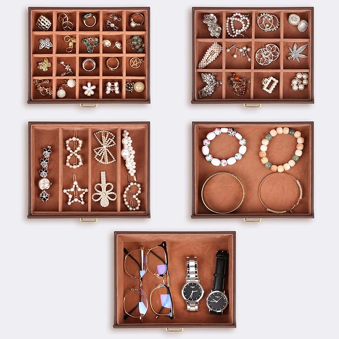 - 5 removable drawers for maximum jewelry storage. The deeper bottom drawer has only one compartment. Its size is 7.31"L x 5.81"W x 2.25"H. The other 4 drawers have the equal size. Their size is 7.31"L x 5.81"W x 1.00"H. Drawer 1 has 20 equal size compartments; Drawer 2 has 12 equal size compartments; Drawer 3 has 4 equal size compartments; Drawer 4 has just one compartment.
