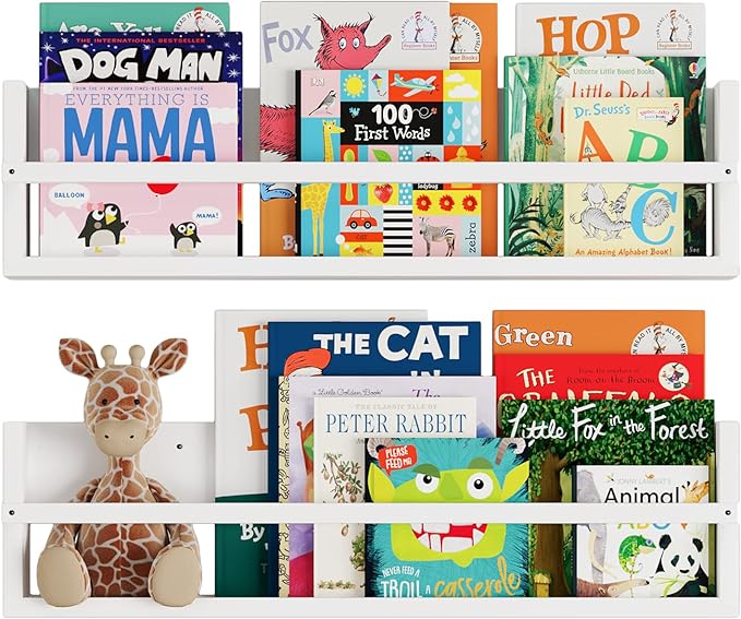 - Nursery Storage: Wall shelves are the perfect choice to achieve a cleaner and more beautiful look in your nursery decor. Polynez floating shelf set of 2 offers you a space saver way to store baby essentials, books, plush toys and more. The front wooden bar prevents the falls of your belongings and helps you to create a safe environment for your baby.