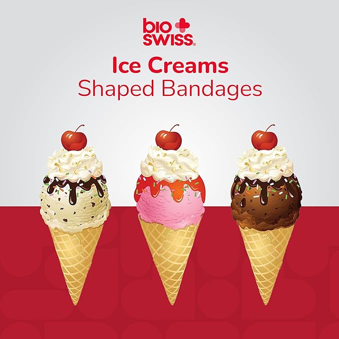 BioSwiss Bandages, Ice Cream Shaped Self Adhesive Bandage, Latex Free Sterile Wound Care, Fun First Aid Kit Supplies for Kids, 24 Count