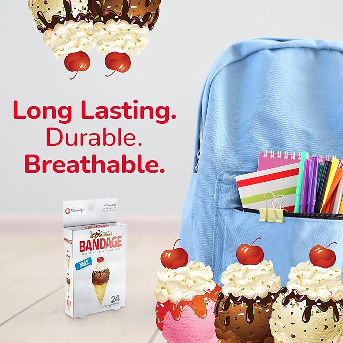 - ICE CREAM BANDAGES: This 24 piece pack of adorable and delicious looking ice cream bandages is great for putting a smile on kids' faces while protecting wounds such as cuts, scrapes, and burns; sticky bandages are perfect for kids and adults alike, and also for school nurses and pediatric doctors