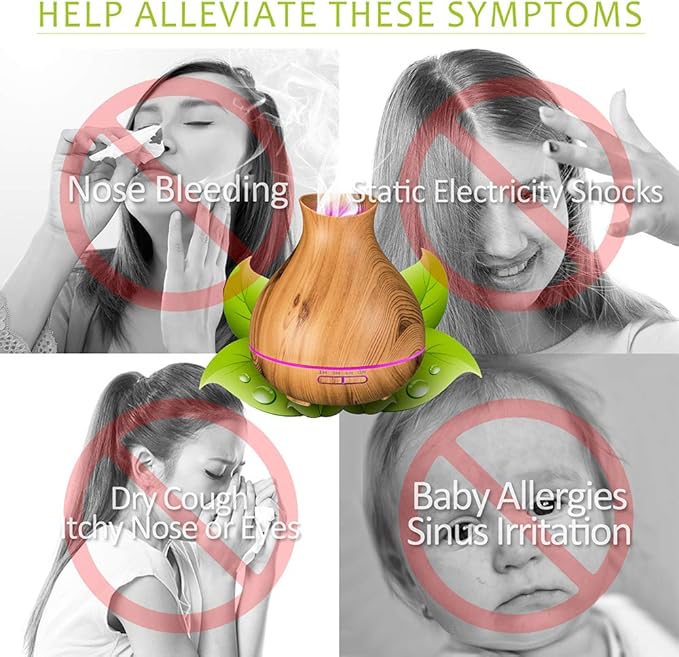 - REDUCE DRY CLIMATE IN WINTER: This aromatherapy diffuser helps to alleviate winter dryness by increasing air humidity. It improves breathing and sleep and reduces static shock in dry climates. Some essential oils can produce a healing effect that relieves your sinuses and can help you breathe better when you use an air conditioner. A great gift for yourself, parents, friends, and partners.
