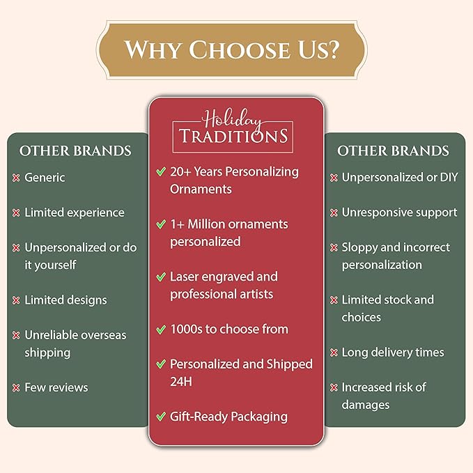 - 𝗤𝗨𝗔𝗟𝗜𝗧𝗬 𝗙𝗜𝗥𝗦𝗧 - With 20+ years of experience and 1+ Million ornaments customized, we’re masters of delivering personalized gifts. Beautiful. Thoughtful. Ordered. Done!