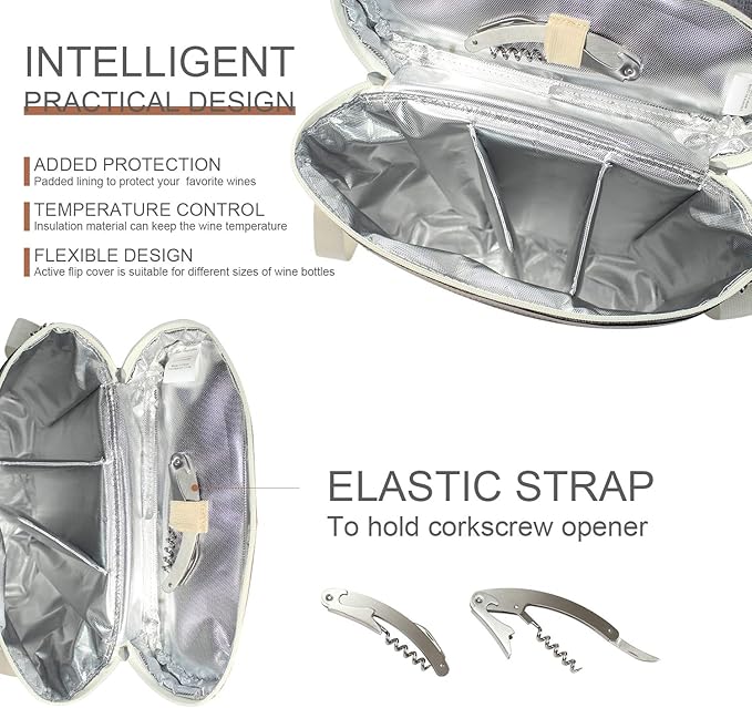 - Portable & smart design - wine tote includes a self-storing wine key, has both a handle and adjustable shoulder strap, you can easily tote your wine carrier by the pu leather handle or the shoulder strap, 2 way separating zipper and stainless steel clasp.