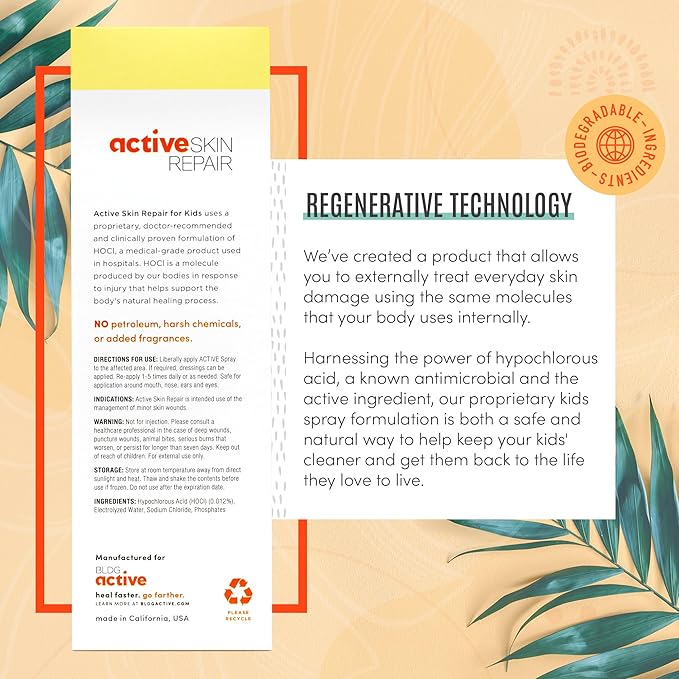 - FIRST AID MEDICAL GRADE HYPOCHLORUS ACID SPRAY FOR KIDS: The technology used in Active Skin Repair is the same safe and gentle molecule used in hospitals and households worldwide; Hypochlorus Acid cleanse wounds to help skin recover faster