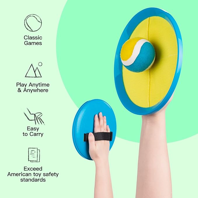 - 【Keep the Kids Active, Learning Basic Motor Skills】The catch and toss game helps kids develop hand-eye coordination and arm muscles, keeping them active and helping to release their extra energy. It is an effective way for kids to learn about baseball and football. EVERICH paddle rackets have been laboratory tested and are safe and non-toxic, so they are safe for kids to play with.