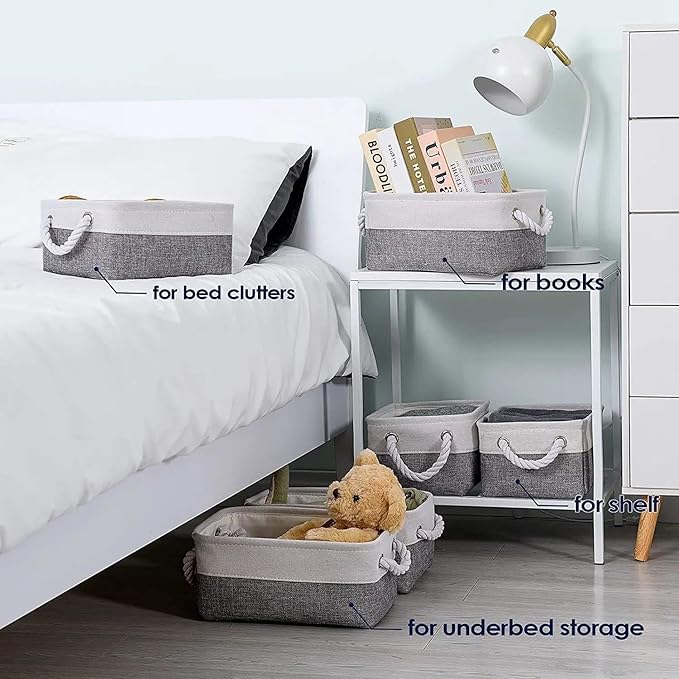 - It includes 6 pack small storage baskets. Sophisticated and practical. Used as closet organization bins, room storage boxes, living room, laundry organizing, basement, cat & dog supplies holder,clothes basket, , garage storage, book and magazine organizer, makeup basket, bathroom towel and toilet storage, shelf fabric drawers and many other uses