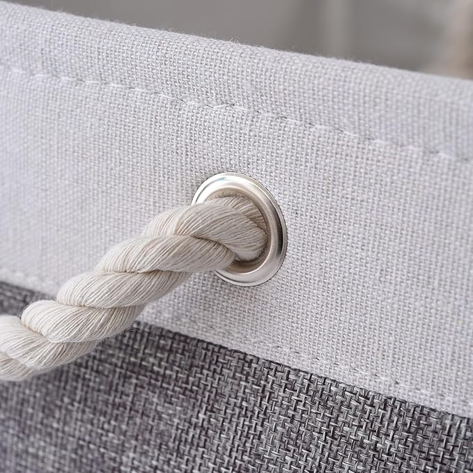- Made of linen and thicken environmental EVA for reliable performance. Dimensions (each): 11.8 (L) x 7.9 (W) x 5.2 (H) inches.This collapsible basket set provides attractive, lightweight storage. Saves space when not in use and collapses flat for easy storage. It helps keep a room looking neat and tidy. The neutral color combination fits most décor while the two side carry handles make it easy to carry