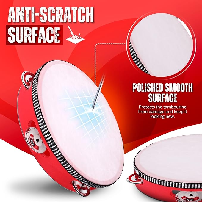 Flexzion Wood Handheld Tambourines - 8 and 6 Inch Set of 2 Pack, with Single Row Metal Jingle Bell (Red) Hand Held Tambourine Percussion Drum Moon Musical Instrument