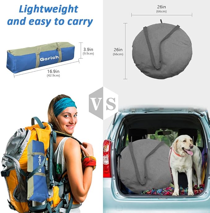 - Easy Set Up & Carry: Setting up fast within minutes. Gorich beach tent is much easier to fold than any kind of beach tents. It could fold down to a travel size of 17"H x 4"L x 4"W, weight 3.5 lbs, with a campact carrying bag that you even won’t notice it on your backpacks, much easy to carry