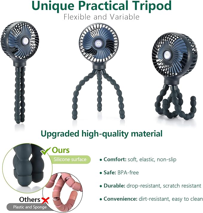 - 【Upgraded Flexible Unbreakable Tripod】snawowo baby stroller fan has an upgraded tripod which is made of high quality bendable metal and food grade silicone surface instead of the old plastic and sponge surface. so you don't have to worry about the baby eating it by mistake. The tripod is waterproof, not easy to get dirty and broken, easy to clean, and more anti-wear.