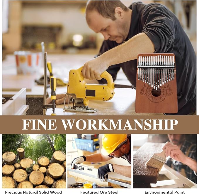 - Beautiful Soud: 17 key kalimba has a warm and rich tone like mahogany, with a sweet and pleasant sound. Finger piano kalimba body is made of solid wood and box structure, with strong resonance and a crisper, louder and longer sound. The kalimba 17 keys tuned in C are staggered for flexibility and wear resistance, and produce a pleasant resonant sound when played gently, ideal for acoustic playing