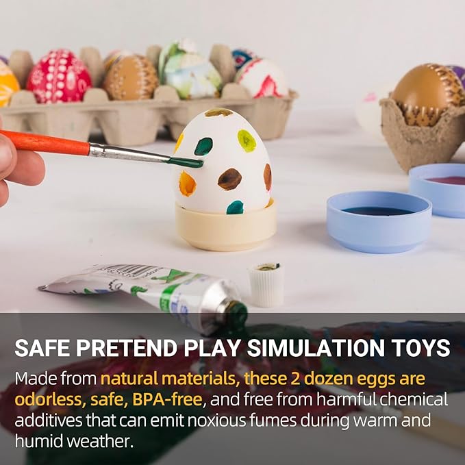 - CHILD AND ANIMAL-SAFE PRETEND PLAY SIMULATION TOYS - All materials used on these fake Easter eggs from the wood to the paint are safe and BPA-free. It's safe even for younger children. They are perfect as a part of children's kitchen toys playset or in a farm simulation playset. They'll have a blast collecting "eggs" from a "chicken coop" and storing them on egg cartons.