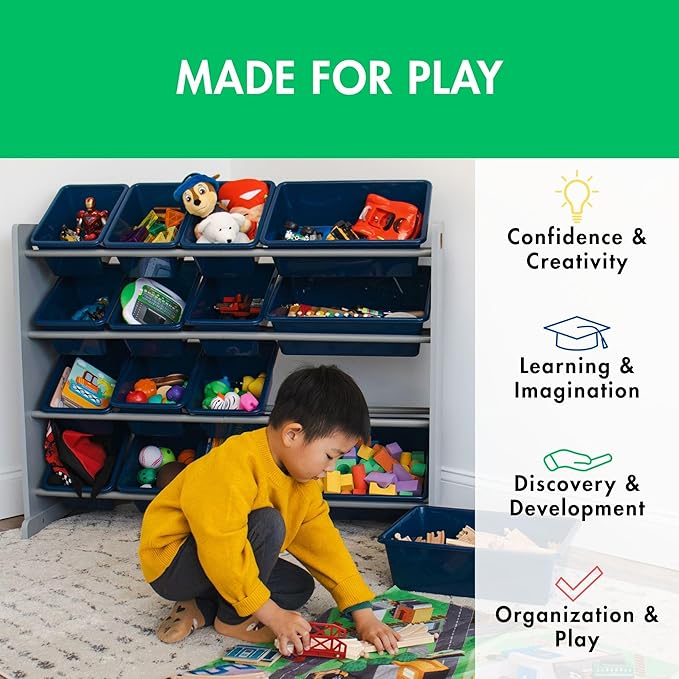 - Supersized Storage Solution: Transform clutter with this 16-bin toy organizer. With 12 standard and 4 large bins, it offers 25% more storage than standard organizers, making it perfect for large toy storage and keeping your kids' space tidy.
