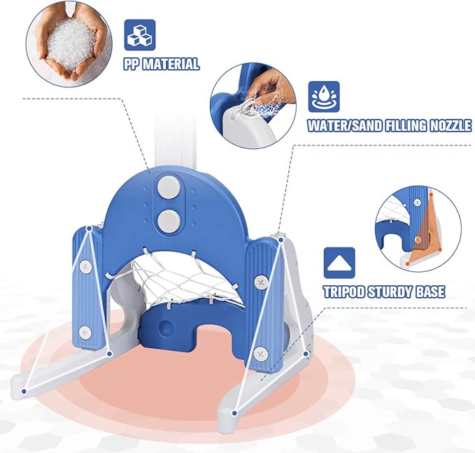 - 【Stable Triangle Structure】 Triangular structure base effectively increases the stability of the entire basketball hoop and can prevent children from being injured. In addition, There is a piston on the base of the basketball hoop. After opening it, you can fill water or sand to increase the stability of the base.