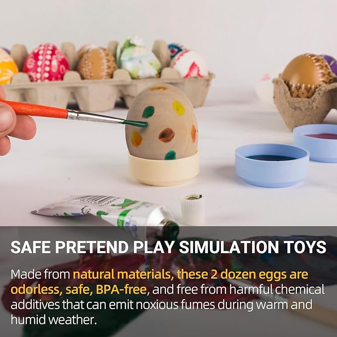 - CHILD AND ANIMAL-SAFE PRETEND PLAY SIMULATION TOYS - Now here’s a fake egg you can let your kids play with. Made from natural materials, these 2 dozen eggs are odorless, safe, BPA-free, and free from harmful chemical additives that can emit noxious fumes during warm and humid weather.