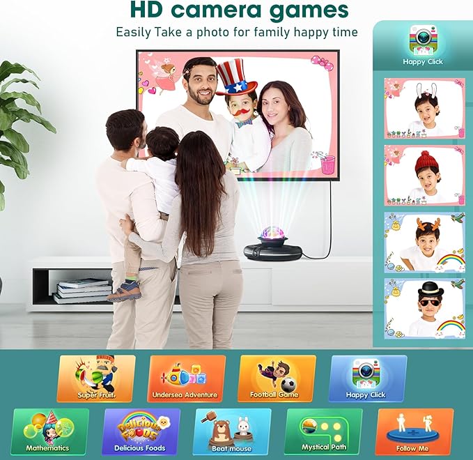 - Plug & Play Dance Party in 5 Minutes: No Wi-Fi? No problem! Simply connect via HDMI to your TV/PC/projector in just 5 minutes. Upgraded IC chip delivers ultra-smooth 4K visuals. The built-in 9 AR camera games, smart camera captures your every move, rendering your figure in real-time on the screen for an immersive experience. The disco ball lights create instant club vibes. Host epic kids’ birthday battles or family game nights effortlessly. Plus, two wireless controllers let you play solo or battle it out with friends!