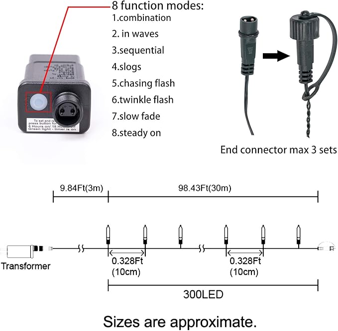 - ·Quite Long Enough Light String - The total length of the light string is 108.27 ft, which contains 300 bright LED bulbs, and can be connected end to end, and up to 3 groups of the same light string can be connected