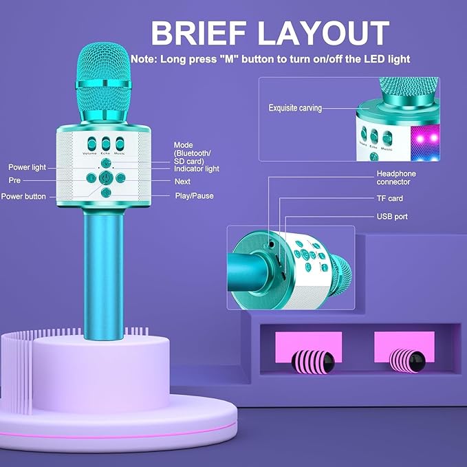 - 【Controllable Dynamic LED Light】— Music~ 27 colorful LED lights will flicker with the rhythm of the music. Higher volume, brighter light, perfectly creating a karaoke atmosphere for you. If long pressing "M", the LED light will appear/ disappear.