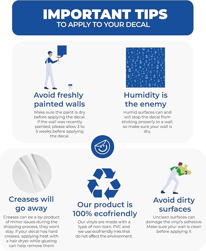 - IDEAL FOR FLAT SURFACES - Our wall decals are best suited for smooth and flat surfaces. We recommend applying them on glass, metal, and smooth walls, avoiding textured surfaces such as stone or brick walls.