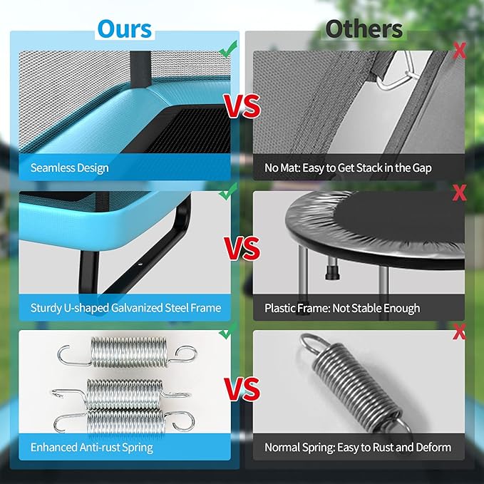 - High Elasticity: Featuring 40 galvanized springs and a high density jumping cloth, this premium trampoline offers an ultimate bouncing experience. Kids will enjoy jumping and release endless energy joyfully. Meanwhile, bouncing helps children bone growth.