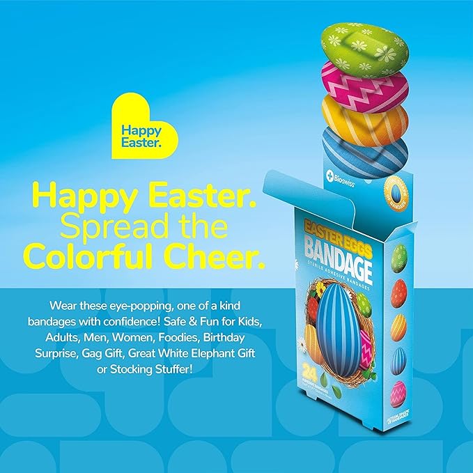 - EASTER EGG BANDAGES: This 24 piece pack of adorable Easter eggs bandages is great for putting a smile on kids' faces while protecting wounds such as cuts, scrapes, and burns, and come in 5 assorted styles; sticky bandages are perfect for kids and adults alike, and also for school nurses and pediatric doctors