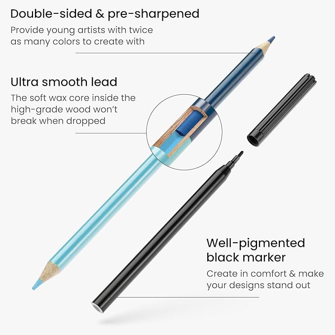 - Complete Drawing Kit for Kids. Includes 12 double-ended colored pencils, 1 pencil sharpener, 1 eraser, and 1 black marker—everything kids need to sketch, trace, and color on the go.