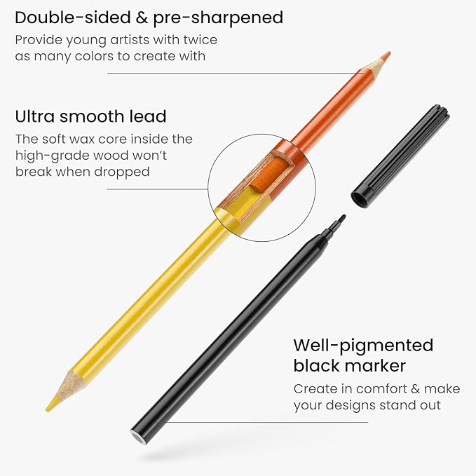- Set Includes 12 Double-Ended Colored Pencils: Our doodle book also includes colored pencils for kids, one pencil sharpener, one eraser, and one black marker.
