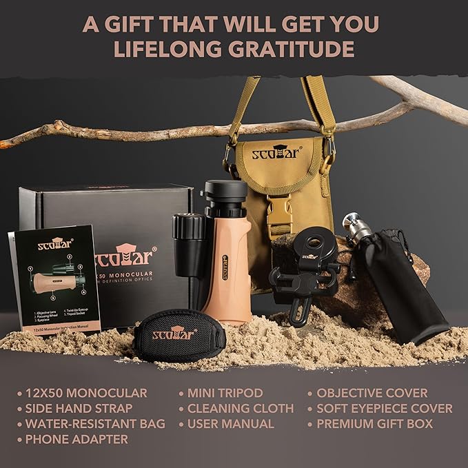 - INCLUDES SET OF ACCESSORIES: Unlike most monoculars for adults high powered telescopes for stargazing or bird watching, Scotar gives you a great bang for your buck. Meaning besides the high-definition pocket telescope, you get a thoughtfully designed pouch, smartphone adapter, and mini tripod that is sure to make your exploring, hunting, or fishing more exciting and fruitful