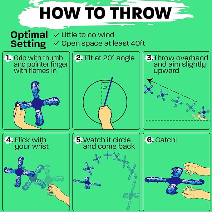 - 𝗘𝗮𝘀𝘆 𝗧𝗼 𝗟𝗲𝗮𝗿𝗻: Embrace the simple joy of throwing a boomerang and having it come back to you with ease. With our beginner-friendly easy to throw design crafted from durable EVA foam. It's stable flight and comfortable grip make throwing and catching a breeze, ensuring a quick and enjoyable learning experience for kids age 6 and up.