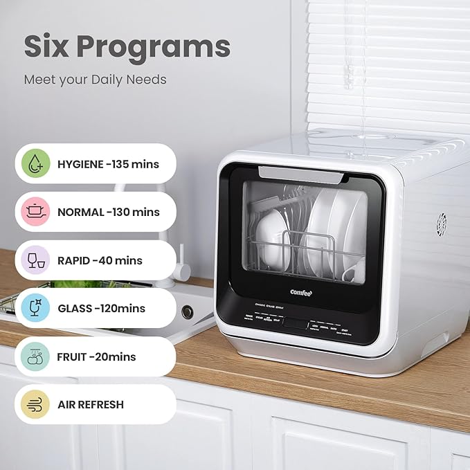 - [ 6 Program Options ]: NORMAL, RAPID, STEAM, FRUIT, GLASS washing programs, and AIR REFRESH extra drying mode meet all your daily needs. Note: Use the standard dishwasher powders or detergents because regular liquid dish soap will cause dishwasher problems. (No detergent is needed for the FRUIT program, and RAPID just needs half of the standard quantity. )