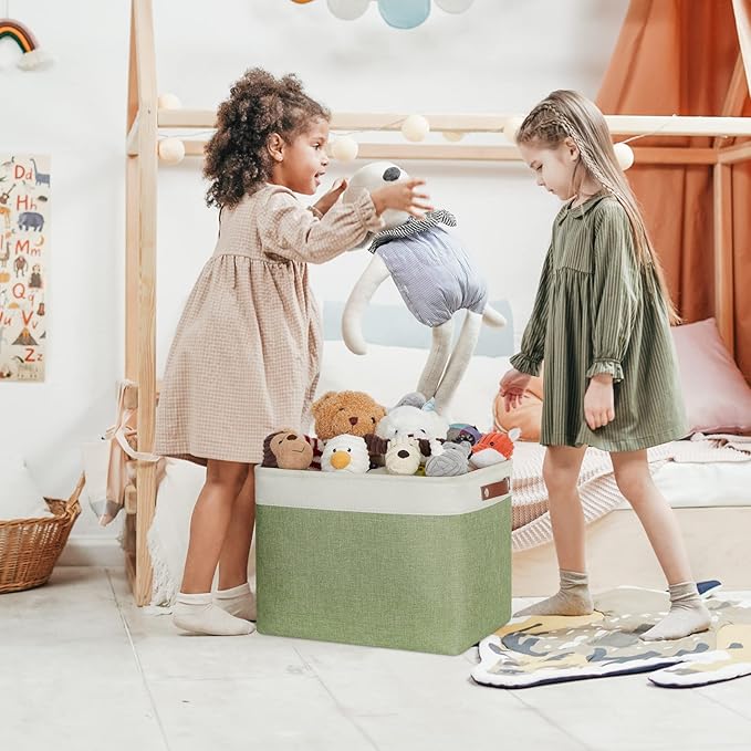 DULLEMELO 2-Pack Large Storage Baskets for Organizing 16"x12"x12" Canvas Fabric Storage Basket Bins With Leather Handles for Shelf Clothes Empty Gift Basket (White&Green)