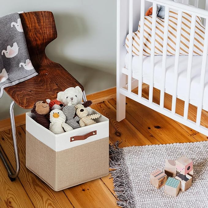 HNZIGE Fabric Baskets for Organizing 13x13 Storage Cubes, Set of 4 Fabric Foldable Canvas Storage Bins for Shelves, Cloth Storage Bins for Cube Organizers Toy Nursery Closet Bedroom?Beige&White?