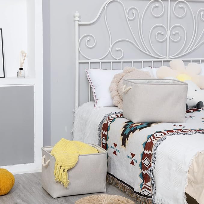 Bidtakay Large Fabric Storage Bins Beige Linen Closet Organizers Set of 2 Baskets for Shelves Clothes Bedroom 16x11.8x11.8 Inch Foldable Organization Baskets for Towels Blankets Storage Dog Toys