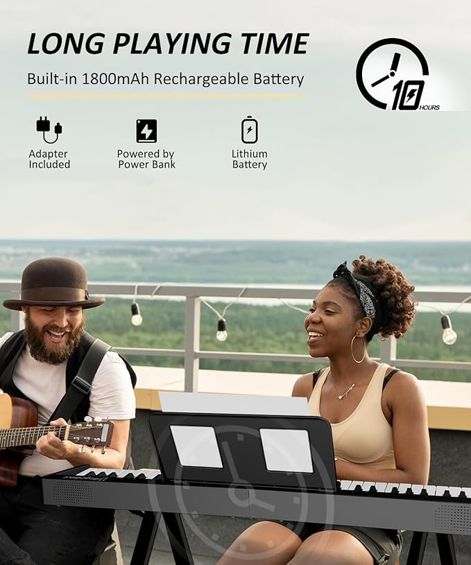 - 【Chargeable Portable Piano】The keyboard piano for beginners has a built in rechargeable Lithium battery, supporting USB charging, power bank charging, lithium battery-powered, 8-10h playtime after full charge. So you can paly it anywhwew anytime.