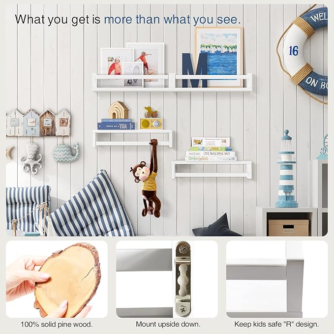 - [Great for Nursery and Kids Room] Mount these floating shelves on your nursery wall, Kids can stow books, toys, stuffed animals and games in wall shelving, where they’ll be off the floor and easy to reach.