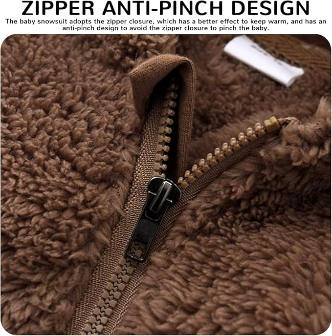 • ❤♥Material: This baby snow suit made of high quality polyester fiber, double lining, fine polyester fiber cares for baby's delicate skin. The newborn winter outfit hoodie whole body jumpsuit design, keeps the baby's head and ears inside and warm when outing. The toddler boys & girls snow suit accompanies the baby through the cold winter.