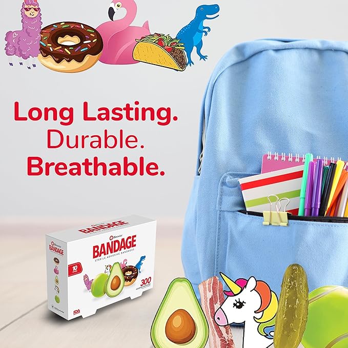 - ASSORTED BANDAGES: This 300 piece pack of adorable assorted bandages is great for putting a smile on kids' faces while protecting wounds such as cuts, scrapes, and burns, and come in 11 assorted styles (Monkey, star, llama, donut, ice cream, unicorn, cupcake, lips, bacon, mermaid, and pineapple); sticky bandages are perfect for kids and adults alike, and also for school nurses and pediatric doctors