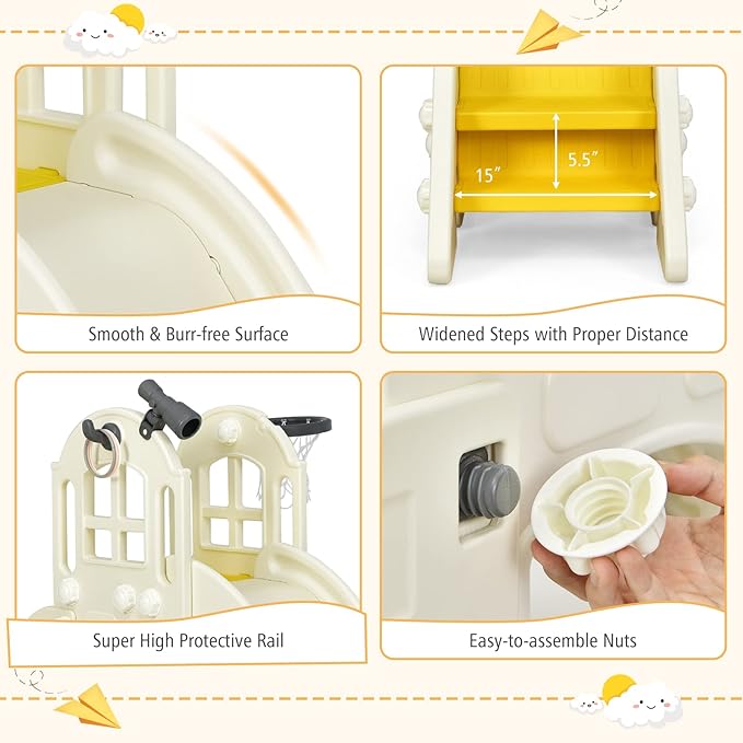 - 【6 In 1 Multi-purpose Sports Center】 BABY JOY large climber and slide playset is designed with 6 activity zones, including a long sloping slide, climber, tunnel, basketball hoop, ring toss and telescope, which make the slide set a paradise for children. What's more, the included small basketball and 3 PCS ring toss are convenient for kids to play. It can be used indoors and outdoors and is the best gift for children.