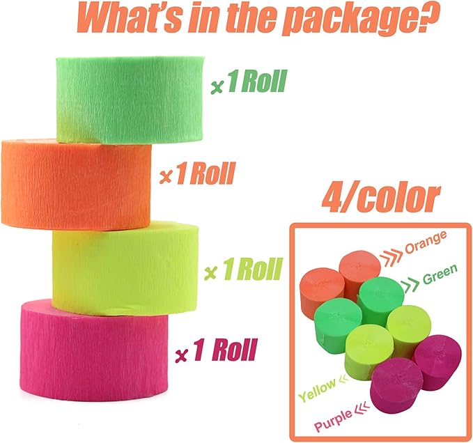 - Ideal Size and Bright Colors: Package contains 4 rolls of large sized crepe paper streamers in 4 colors of green, orange, yellow, pink. They are Neon Colors under normal light, but glow under black light. 400 feet/Each roll measures approx. 1.6 inches in width and 100 ft in length. Ideal Size for neon Party supplies