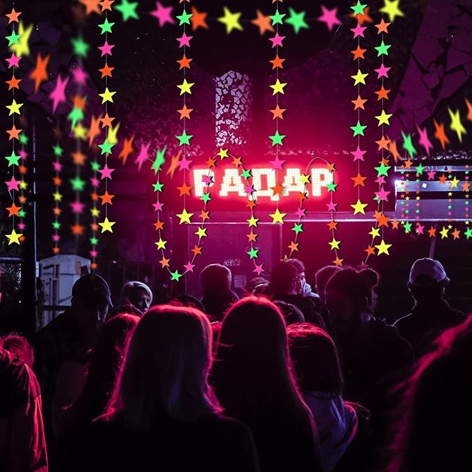 - 【Reliable Material】 These star neon streamers are made of High Quality Neon paper, which is Durable and touch smooth on the surface, lightweight reusable and long-lasting. The UV reactive garland is Ideal Neon Party Supplies and glow in the dark accessories, Bring the Party to a More Visible and Bright Scene.