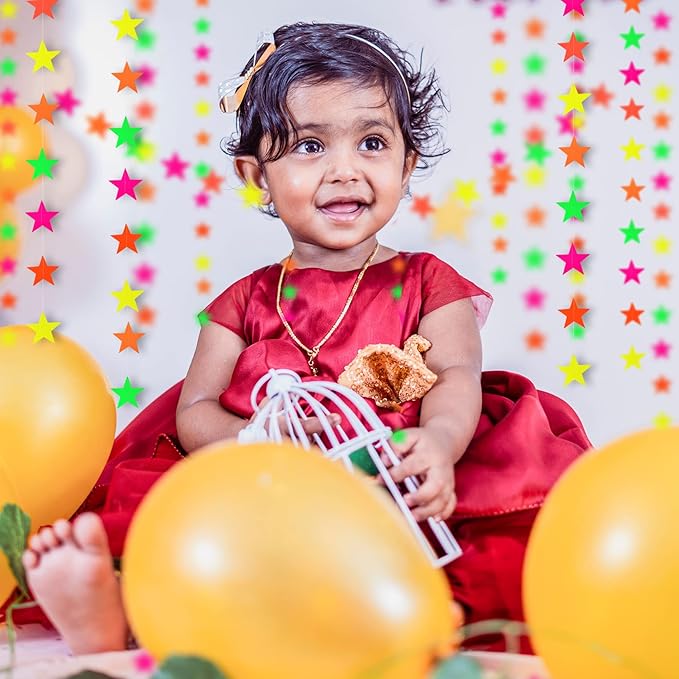 - 【What you can GET】Package Includes: 6 packs of 18 feet long fluorescent star paper garland, each have 40 Stars, diameter about 2.67inch. These Star Garland Combined with 5 colors, that is pink, orange, green, yellow, and red. which will certainly be a huge hit at any neon theme or glow party