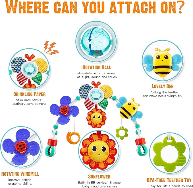 - Entertained Car Seat Toy: Keep your baby engaged and entertained during car rides with this stroller arch toy that conveniently clips onto your little one's car seat handle.