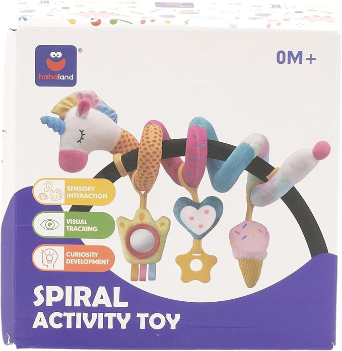 - REMAIN STRETCHED and EASILY ATTACHED TO THE CARSEAT: There are Velcro on both sides of the unicorns spiral plush, which make it remain stretched and easily and safely attached to any nursery device with handles and prevents the toys from falling on the baby's face. The interesting patterns, and vibrant colors appealing to the baby and entertain them throughout the long trip and encourage them to explore them more
