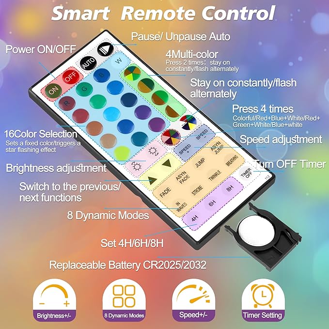- Remote Control String Lights:Twinkle lights provides remote to power color changing string lights on/off, change 16 single colors and 8 mixed colors, choose 128 dynamic modes, adjust 4 speed, set 3 timer.The string lights indoor will remember the last option it previously set