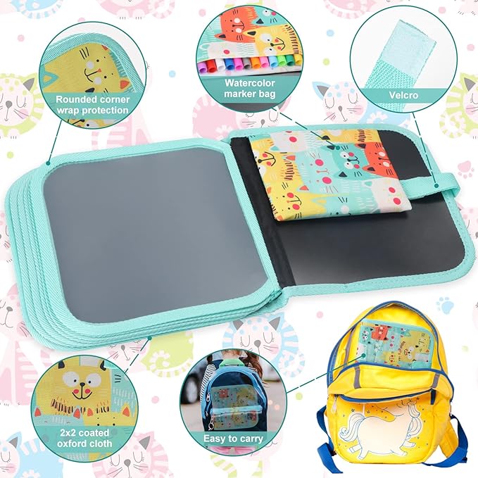 - 🎨Kid's Road Trip Essentials--Kids Erasable Graffiti Book has sticky buttons on the outside to keep it in place and a pens pocket on the inside for 12 watercolor pens. Even in cars, planes and other means of transportation, kids can draw as much as they want.
